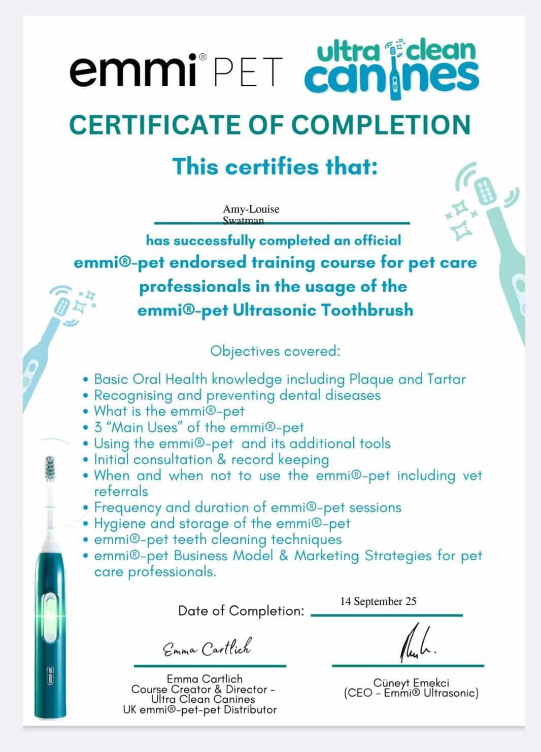 Completing the Ultra Clean Canine Emmi-Pet training was the first step toward Amy-Louise’s goal of becoming self-employed. The course gave her the confidence, skills, and understanding to launch her own Emmi-Pet service, blending her dental expertise with her love for animals.